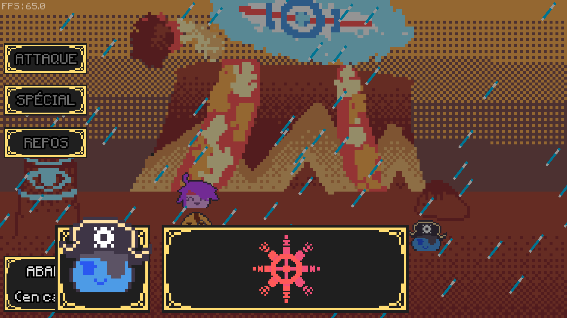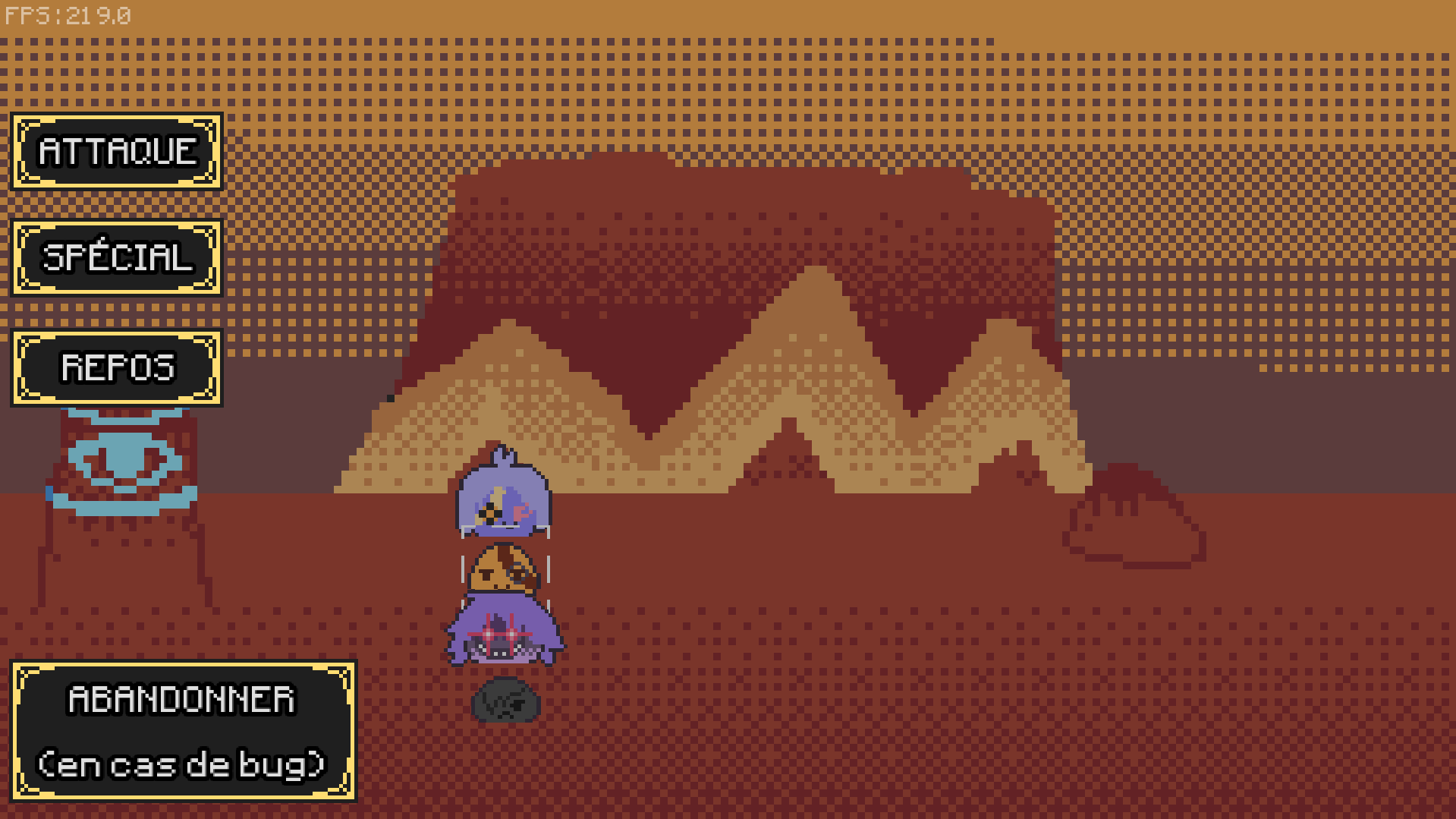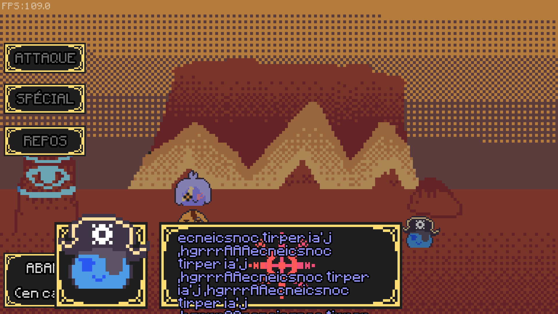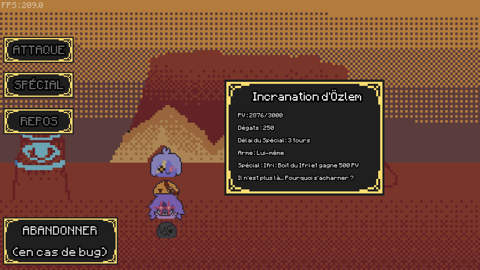Et surtout le gameplay est par moment carrément mal fait. (la bar de dégât qui bug un peu mais c'est pas le plus grave) Il faut vraiment qu'on puisse changer d'équipe quand on perd ou qu'on abandonne parce que là on est obligé de gagner le combat avec une équipe qui si elle est mauvaise est impossible à gagner (soft lock) surtout que la touche pour la changer n'est pas indiqué (je suis peut-être aveugle) et que je l'ai trouvé que par chance (E pour ceux qui se demande). Et oui les combats, et, plus particulièrement le dernier combat, sont buggés, la plupart du temps pas de problème (quand j'affrontais le zombie à la grosse épée un de mes slimes c'est retrouvé devant le zombie mais heureusement ça n'impactait pas le combat). Par contre, le dernier combat... à la base je voulais vraiment terminé le jeu sauf qu'au boss final je perd (oui je suis pas très fort) et quand le combat redémarre :