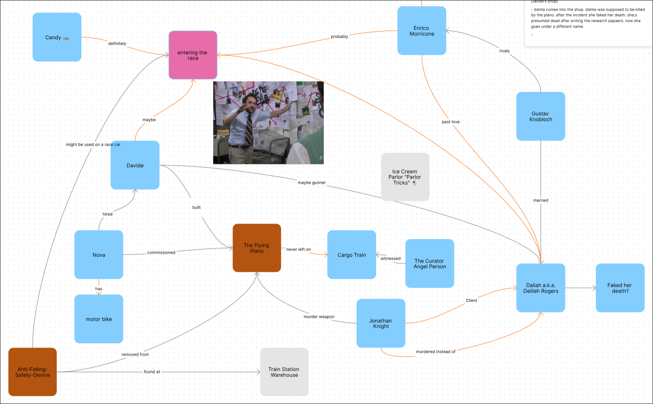 Together, we'd determined a number of things. We found out that the Knight's brother was never the murderer's intended victim - that was actually a different NPC we'd met. We found out where the murder weapon ended up. We drew a whole sticky-notes-and-red-string conspiracy board to figure out which NPCs are connected to which events and how.