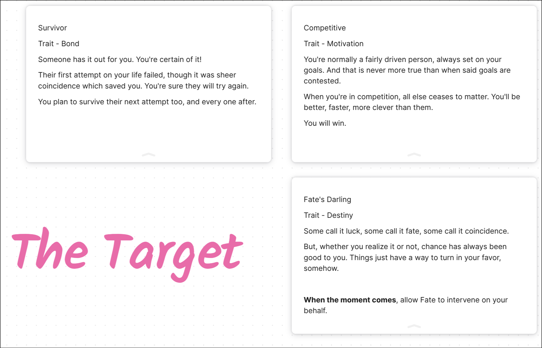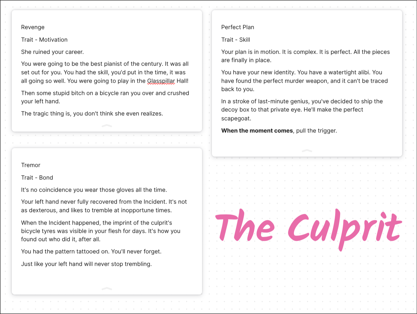 Now, our Knight is a private detective who's trying to figure out who murdered his brother seven years ago. This kind of precluded that our overall story would revolve around solving this murder mystery. But all across our first session, the players had engaged a lot more with the Thief and Seer's traits - we learned about a street race (tying into the Thief's "Reckless Driving" trait) and we got into a duel (with the Seer's "Expert Duelist" trait). We also had a lot of fun coming up with new NPCs together, and giving them all sorts of connections to both the PCs and to other NPCs. Love triangles, mafia connections, rivalries, we had it all. And while this was all great fun, as a GM I struggled to somehow tie this in to the original murder mystery.