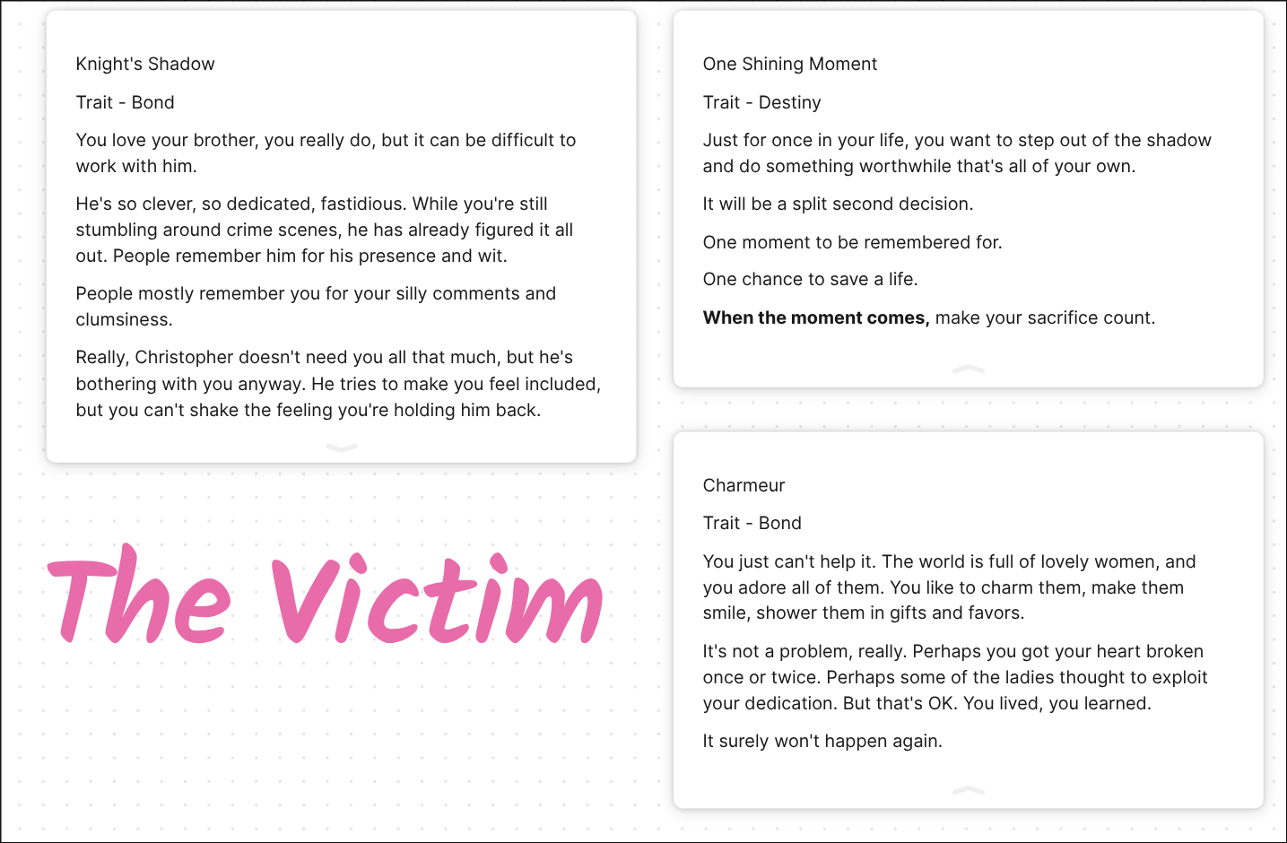 Each mask had three traits. The Culprit's traits explained the murderer's motive, explaining how the Target had wronged them in the past. The Target's traits explained what brought them to seek the help of a private investigator (that would be the Knight's brother, who was a private detective just like the Knight - we'd established that the Target was the Victim's client at the time of the murder). And the Victim's traits contained the clue for why the Victim died in the Target's place.