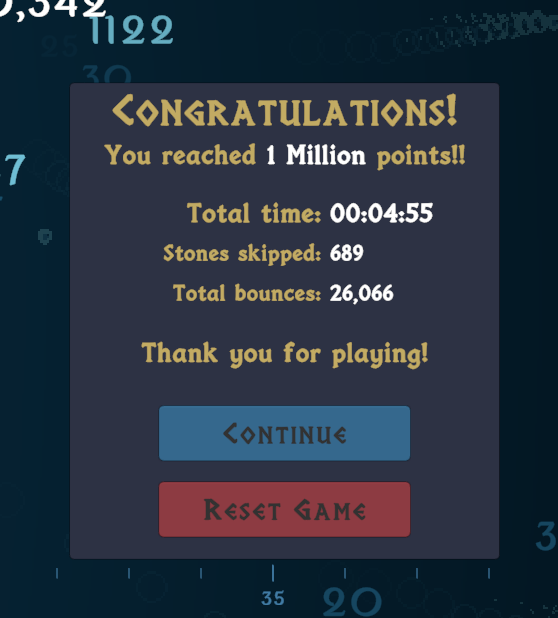 Also some of the variables are in fact more complex than what is presented. For example technique is not just a single threshold on the minimum speed for ‘allowing’ a bounce, there are in fact 2 thresholds, one that says ‘if speed above X, then always bounce’ (proba_bounce:1) and a second one (lower) that says ‘if speed below Y, end the ricochet’(proba_bounce:0). In between these thresholds I interpolate the probability depending on current speed. The stones quality is even more complex: stones have values for each of the existing parameters (speed_bonus, control_bonus, spin_bonus…), and these value are between 1-2 (rank F) and >500 (rank S+). Each of these values increase slightly one of the parameter of the throw, for instance if I remember correctly a stone with >500 spin_bonus will have +10% to the current spin value… So… (And the type of stone found will also have a bonus in one of the characteristic by default).