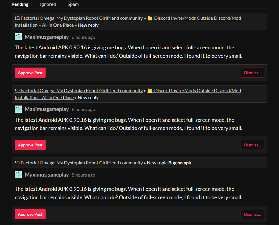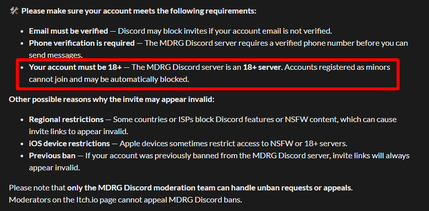 Moderators on the Itch.io page cannot appeal MDRG Discord bans.
