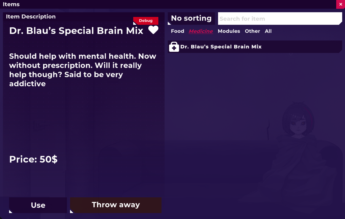 This item becomes available if you follow the Sanity path and accept Dr. Blaubleimβs treatment after your sanity has been low for several days. Itβs a medicine item that temporarily increases your sanity when used, although it may have some side effects.