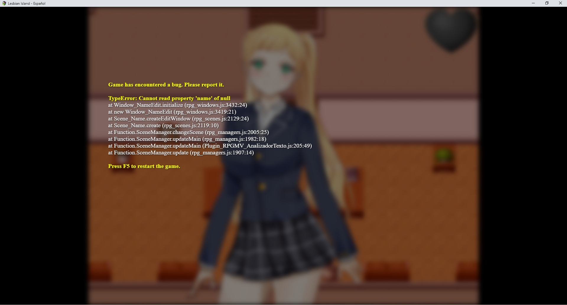 <img src="https://img.itch.zone/aW1nLzI2MDE4MjczLnBuZw==/original/ts067v.png"> I´m having a bug that appeared when I try to change the hotel's name, in the part of the mission where you have to wait until 3:00 PM to enter the hotel.