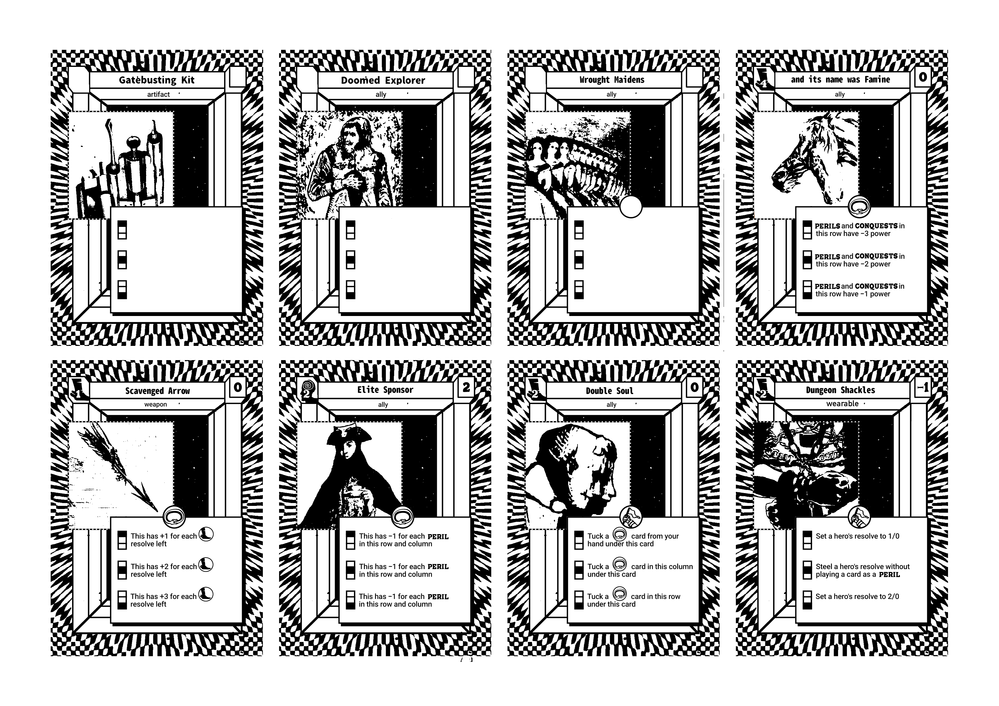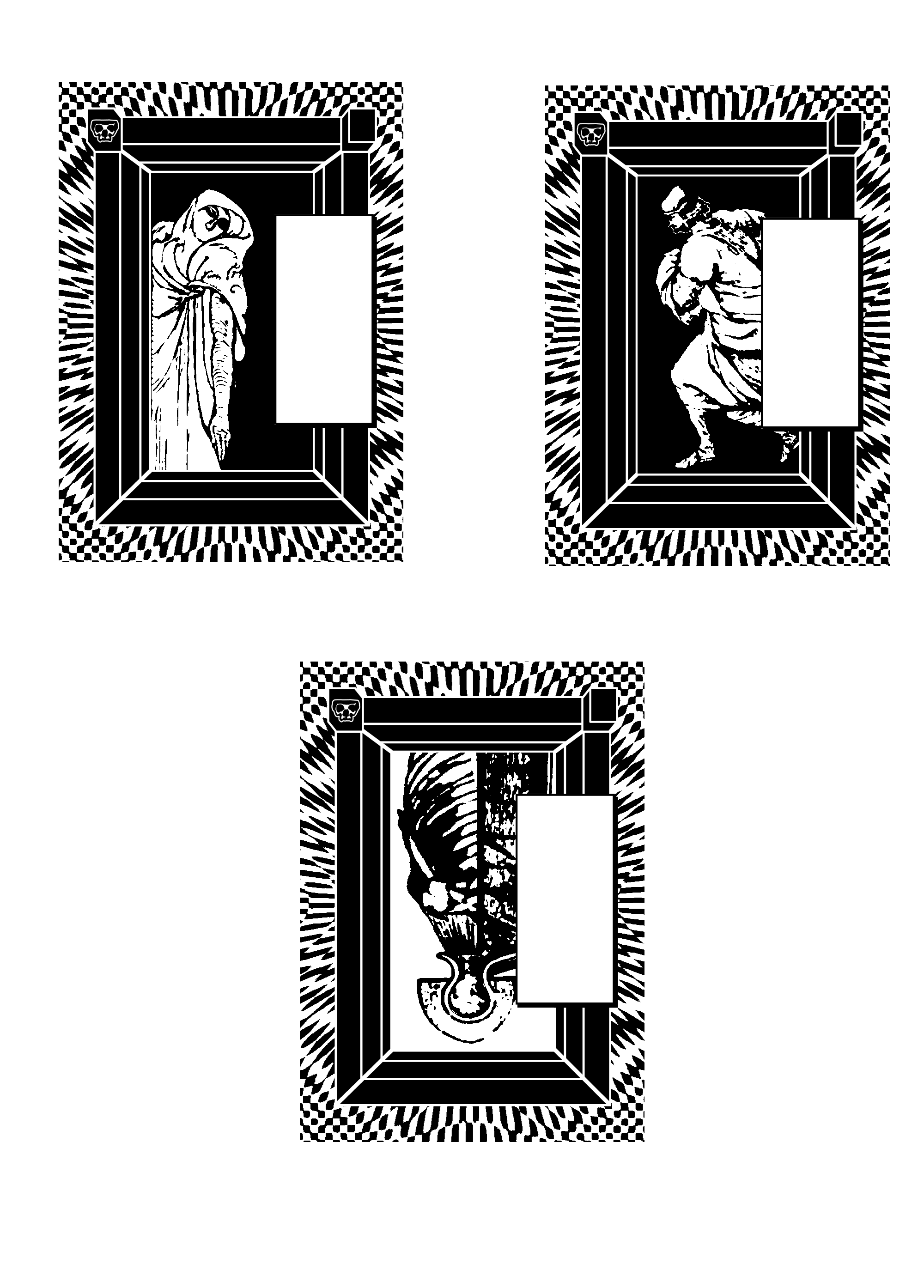 I like how they came out. The first one is for the Wrought Maidens. Some sort of protector figure overlooking them. The second one is for the Elite Sponsor, the Coward. And last is for the Dungeon Shackles. An iron maiden with viscera on its half. (It's a ribcage from an old anatomy book. Too gorey?)