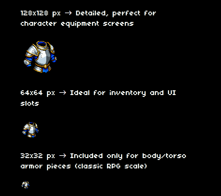 I only made the torso parts in size 32×32, because I no longer considered the rest to be worth selling. I do pay attention to quality, don’t worry. But it also says in the text: “32×32 px → INCLUDED for body armor pieces (classic RPG scale).”My description says: