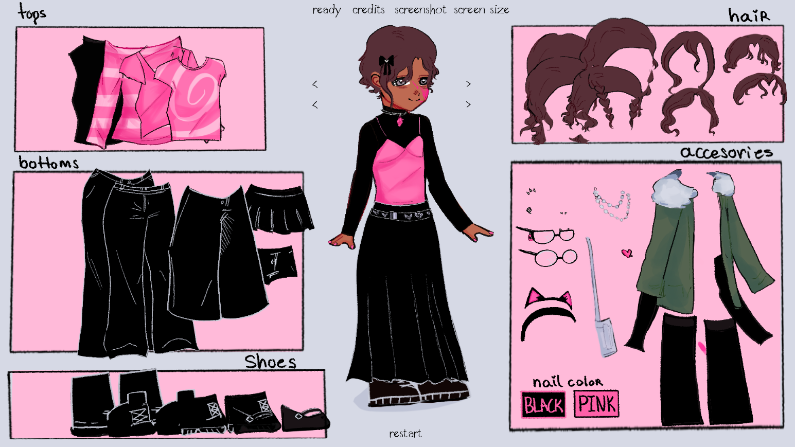 what an interesting twist! i'm always a sucker for a dress up game with a story. respect that you did all of this on your own, that must've been a lot of work! one thing is that the hair section is a bit hard to navigate, but it's absolutely not a game breaker.