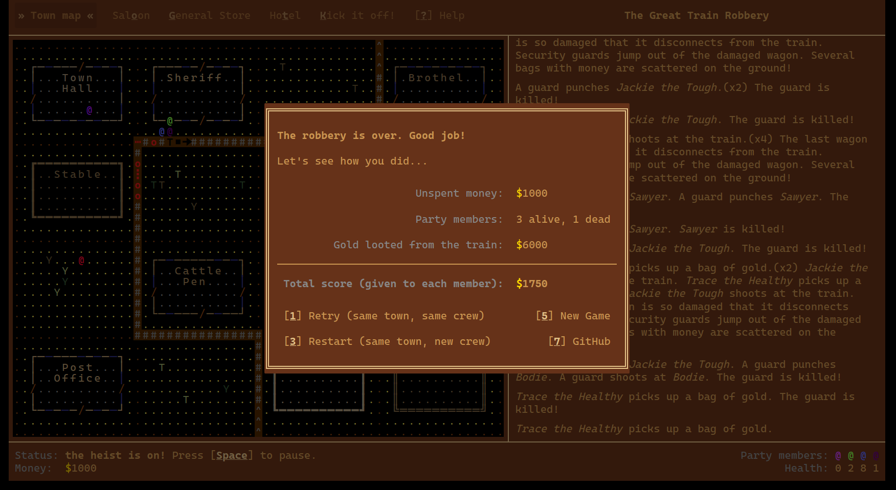 Extremely fun, thank you! World needs more heist games. :) The ability to retry the same heist with minor changes to the plan really makes this shine. This is the highest score I've got so far though I'm sure I could do better. I couldn't quite seem to get sniping from a roof to work? Not sure what I was missing there. My only criticism is that the map action would be easier to follow if civilians and crew had different colour schemes. I also had one run softlock on me as two of the crew were stuck moving back and forth around a train track corner - I changed the start location of the crew member with the dynamite and that seemed to help.
