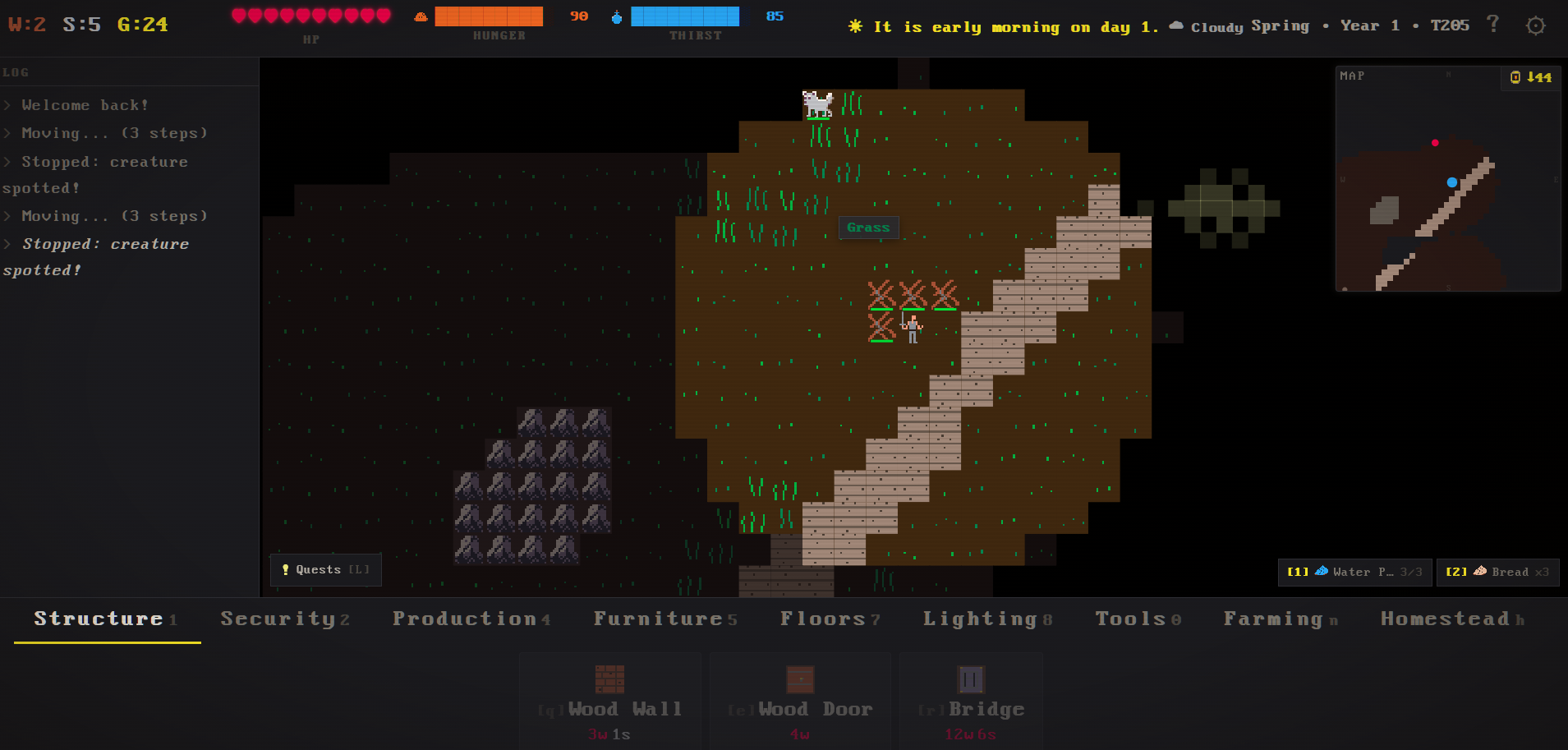 I was playing the web version, just walking around. Walked into this town or village, and suddenly a wolf entered the top of the screen and I couldn't move any more; every time Id click a tile it would say "enemy spotted" in the log. I could go in and out of look mode, place buildings, etc, but just couldn't move.