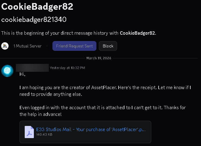 I believe I reached out to you via discord with the receipt attached. Let me know if you need anything else or didn't receive my message.