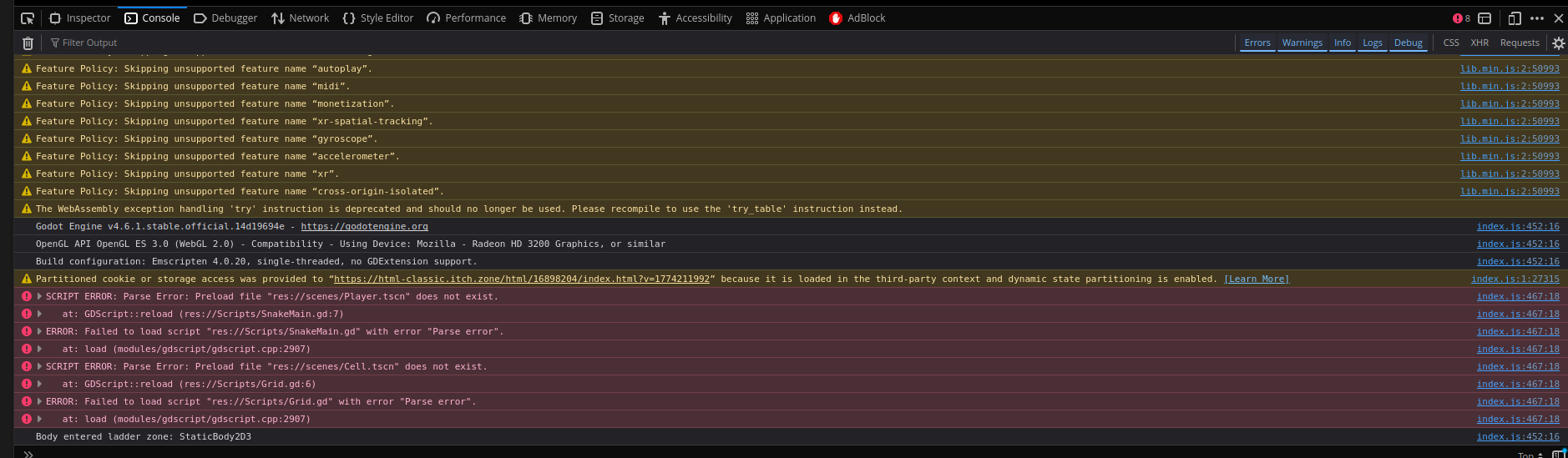 I couldn’t play the game because when I interact with a grave, the screen turns black and nothing else happens. I opened the console, and these errors appeared when I hit play, before interacting with the grave: