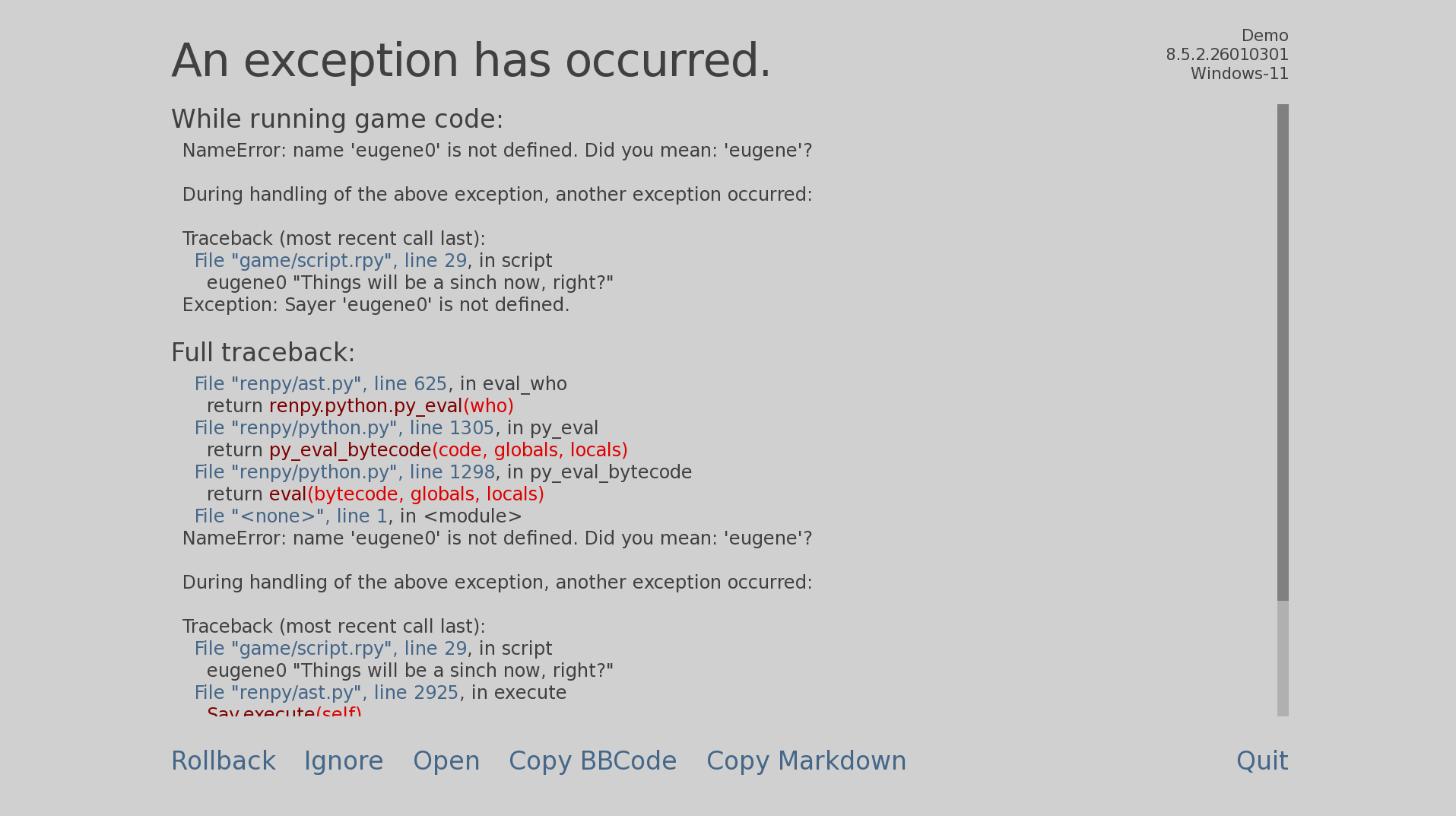 this error shows up right after the first dialogue, it's still playable if you press ignore
