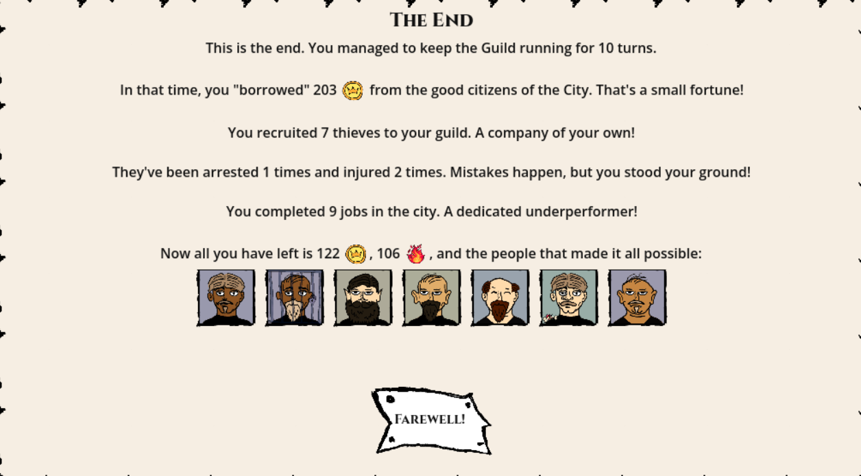 Thank you, kri5z did a really good job with the audio, with very little direction from me. I'm glad you posted this, it's really cool to see how people did! The endgame summary was actually a late addition, I felt the game needed some more personal touch.