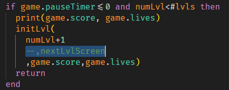 initLvl only takes 3 parameters, so nextLvlScreen is an extra one that shouldn't be there. Just removing it makes it work.