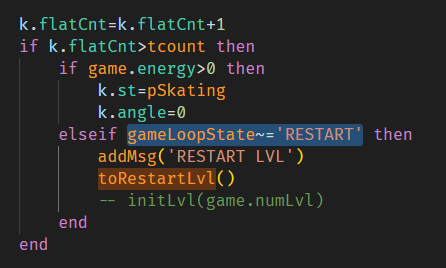 Also, I noticed another bug: if you die by going out of bounds for too long, your lives drop to zero. This is because the toRestartLvl function gets called in a loop, and since every call drains a life, they all drain at once. You could easily fix it by adding this condition: