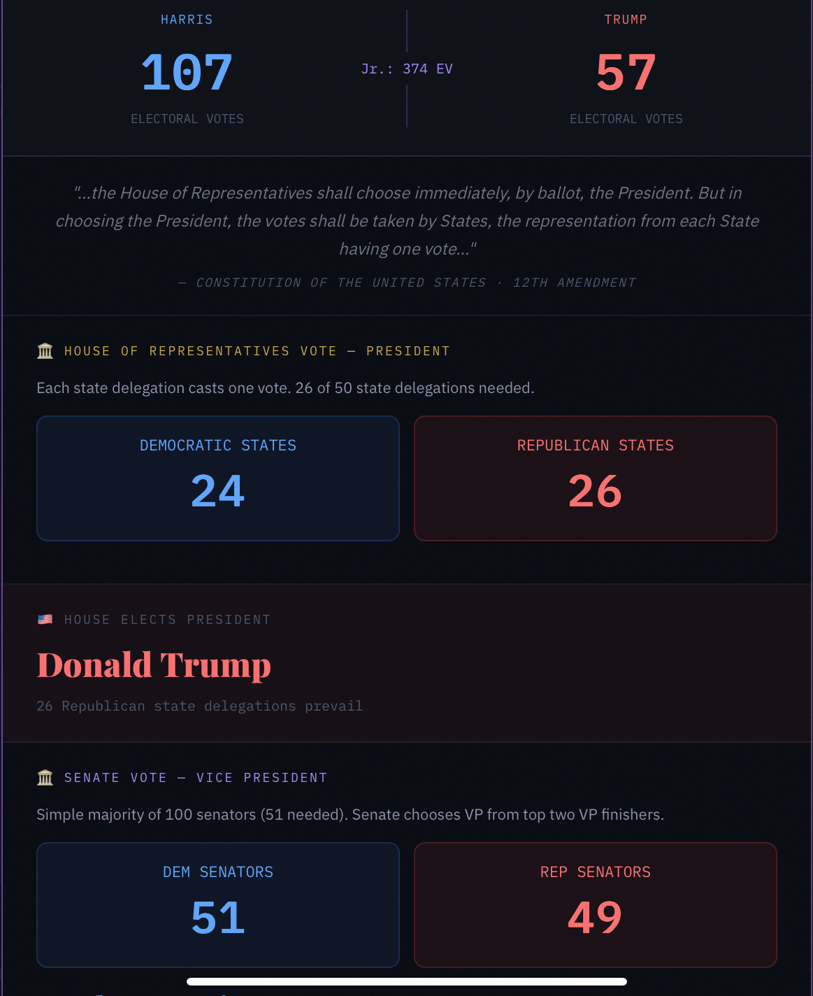 I found a glitch. When the 3rd party candidate gets a majority of electoral votes when simulating an election, it still goes to the House of Representatives/senate.