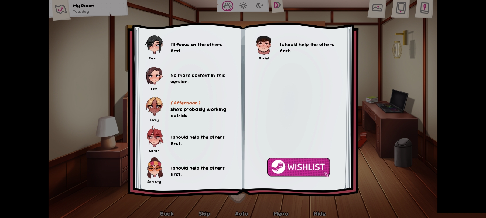 dude what should i do now,how do i continue the story, everytime i click on emily on the afternoons nothing happens, im currently playing the 0.14 of the game bit i swear the game had more contents back then