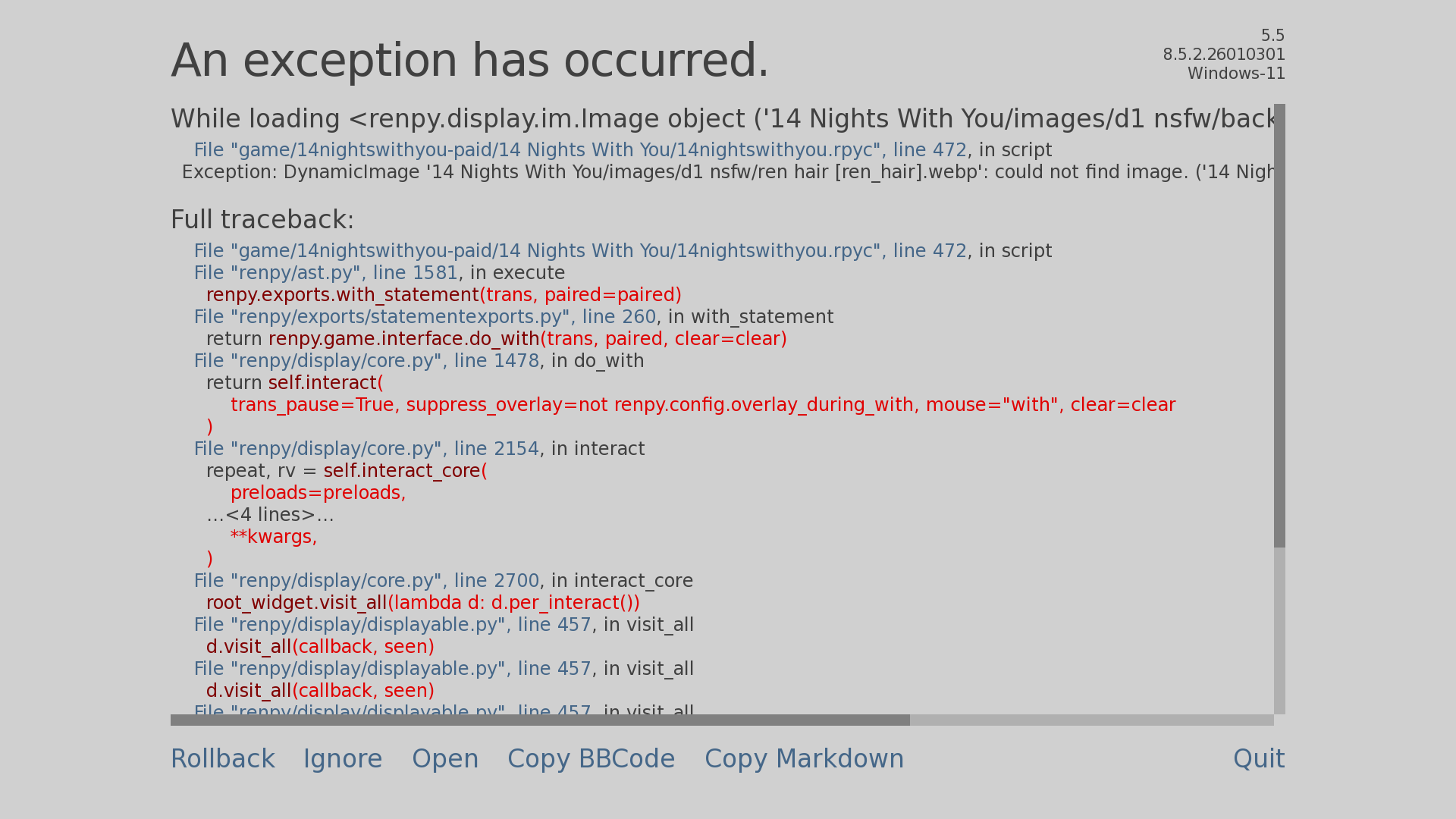 Whenever I try to progress on the day one scene it pops up with this error screen specifically when running the CG, any ways to fix this to where it will show? D: