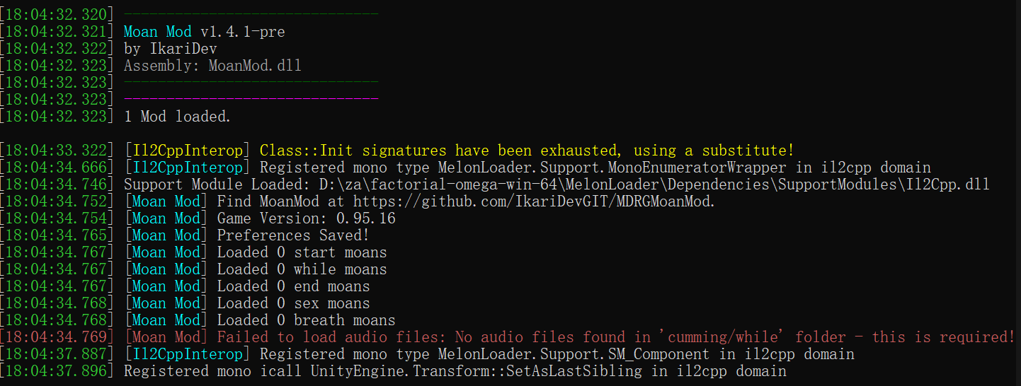 I would like to ask how to resolve this situation. I installed MelonLoader version 0.7.2 according to the video tutorial, and the game path is in pure English, but after launching the game for the first time, this situation occurred, and then the game window automatically popped up, and the mods did not take effect.