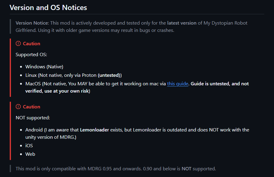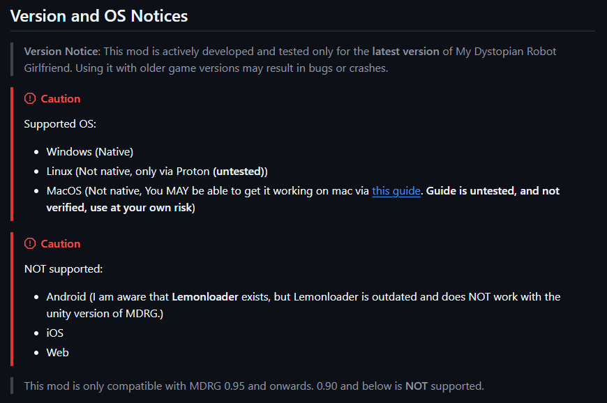- Supported platforms: Windows and Linux only. Not compatible with Android via LemonLoader or Mac.