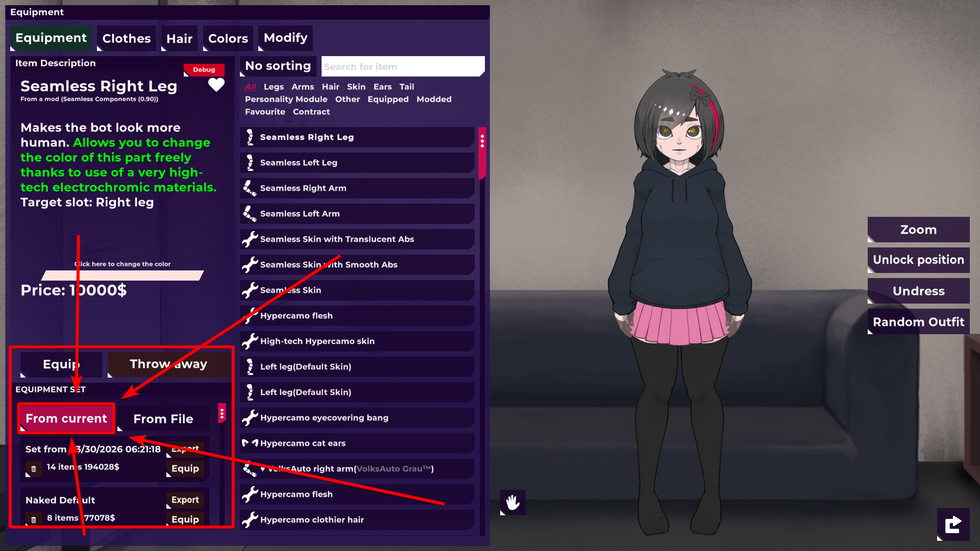 2️⃣ At the bottom left of the Equipment / Clothes menu, click “From current”.