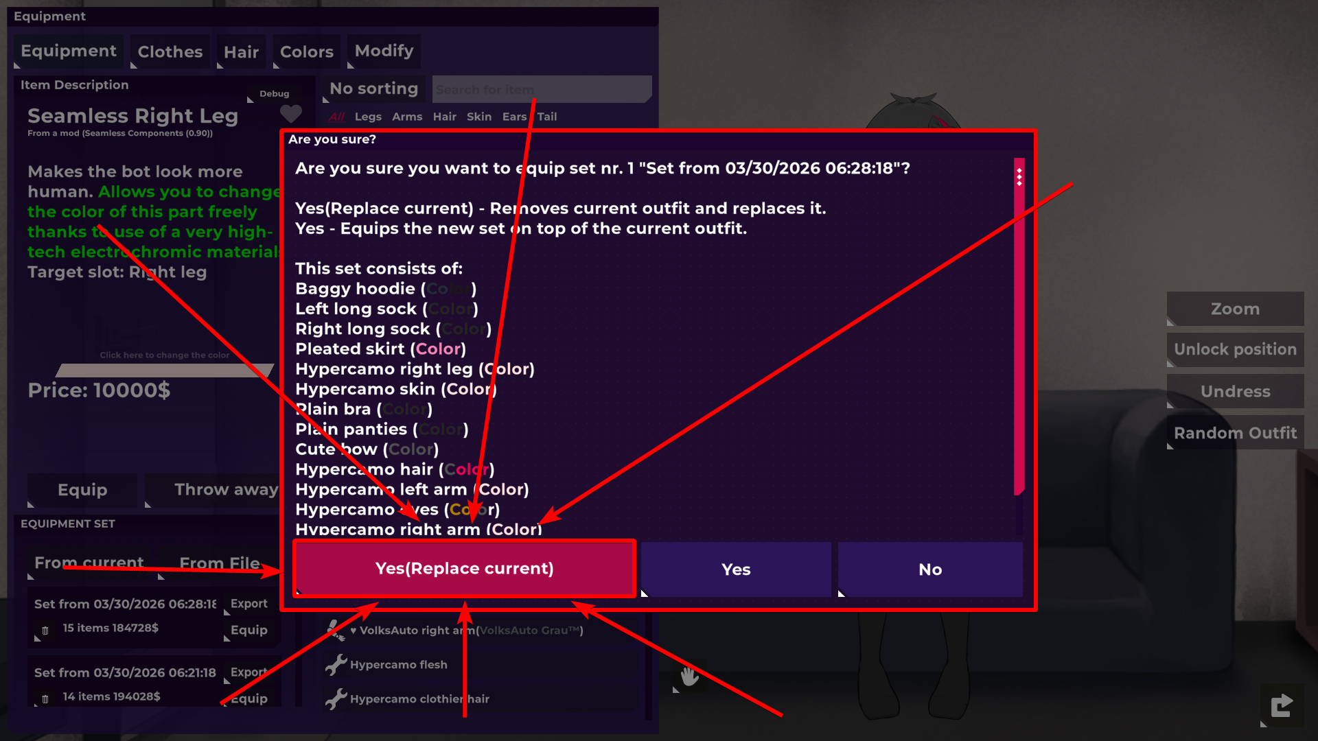 - Yes (Replace current) → Replaces everything Jun is currently wearing