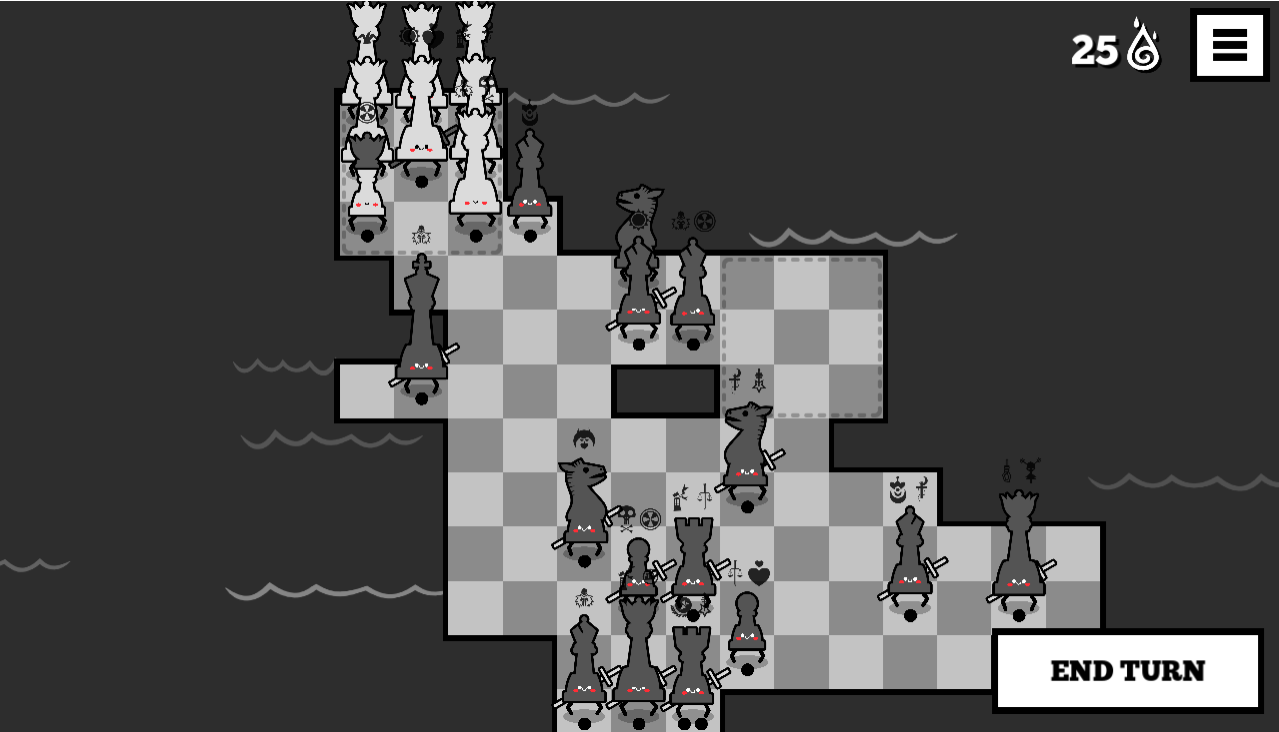 I had a queen with 5 moves and Moon and Death cards which I moved around killing pieces until I accidentally killed one with a Justice card. Then the game got stuck. Animations are still playing but I have no pieces with moves and the end turn button is broken. It still has clicking animation but nothing happens.