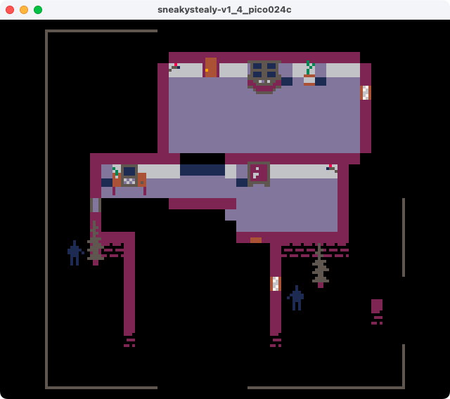 Not that I'm obsessed with this game or anything, but I've found a bug (or possibly a cheat?). If you rat on each other from the menu while in control of a camera console, you restart the game but whatever the flag is that allows you to view all the cameras isn't reset so you start the new game with full visibility of all cameras in a level. That carries on through as many levels as you like UNTIL you log into and out of another camera console. It makes levels easier in the sense that you have better visibility of rooms you aren't in without having to find a safe camera console to access, but if you want to maintain that benefit, it means you can't temporarily disable cameras from a console. Screenshot shows a level where I can see from both cameras while both thieves are outside.