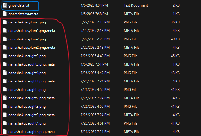 - Blue one (name must be same) will have all data about the ghost and the one is red is sprite(can name anything as you need to put same in ghostdata.txt). Ignore the .meta ones as they will not appear for modders.