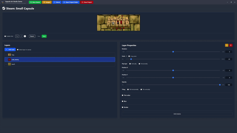 I just released Capsule Art Studio. I built it because I was tired of wasting time and energy manually resizing assets for different storefronts and social media, only to realize I’d made a mistake and had to redo everything, or spend hours updating them all for just a minor change.