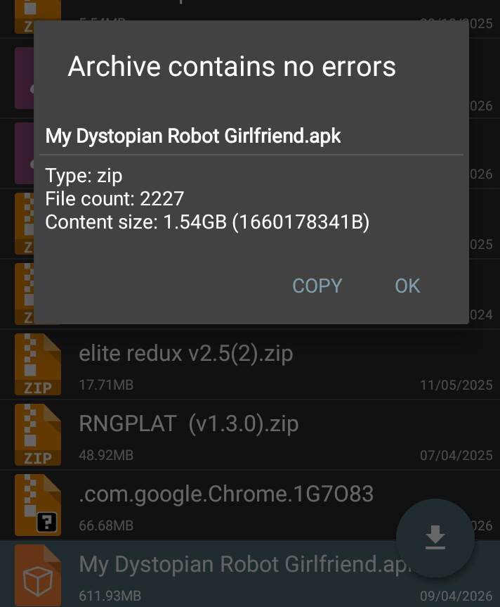 I already deleted the game and tried to download the new version. Testing it with zarchive gives a type: zip. Is that supposed to be called zip even when being .apk? Maybe my worst nightmares have come true and will continue to haunt me until I get a pc or smth.