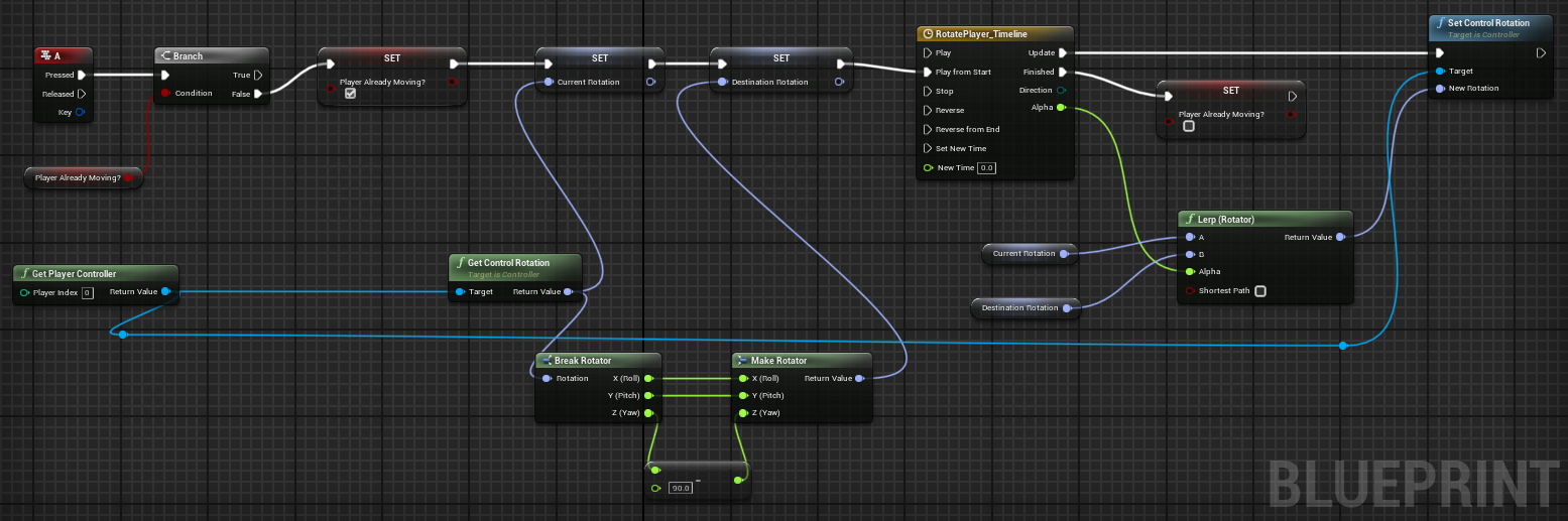 I found out this method after the jam ended xD Gives perfect 90 degree turns! Just make sure on the character Use Controller Rotation Yaw is turned on! (If you don't set the values before the timeline starts it and the Lerp freak out)