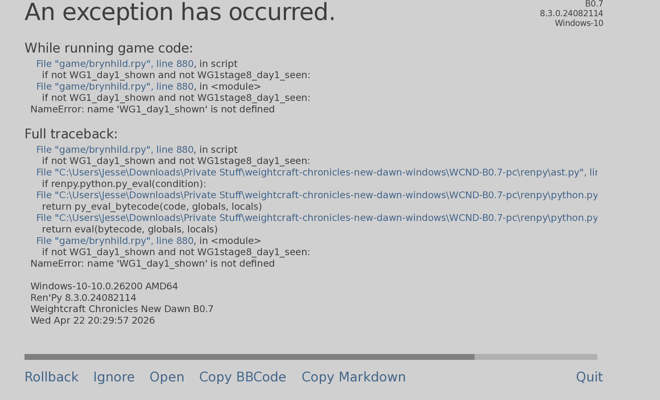 surprised that hasn’t come up before now. I’ll need to patch that for future versions. Quick fix is add the following to Brynhild.rpy: default WG1_day1_shown = False and that should let you pick up from where you were.