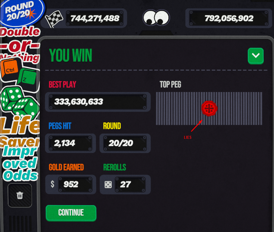 Won on my second attempt, woo! Never used Steel, Glass or Vampire pegs (despite what the win screen thought), though that seems to be the most common high scoring path at a quick perusal of the comments. Didn't think to screenshot my board, but it was pretty heavy on stone modified purple and lucky pegs, and purple modified stone pegs.