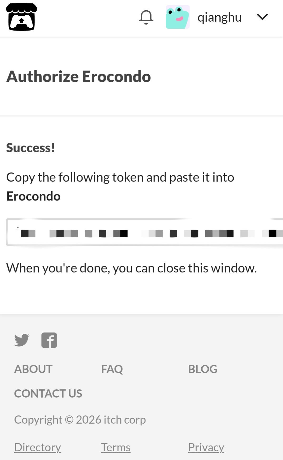 2. I was first redirected to itch.io, where I copied and entered the token as instructed.