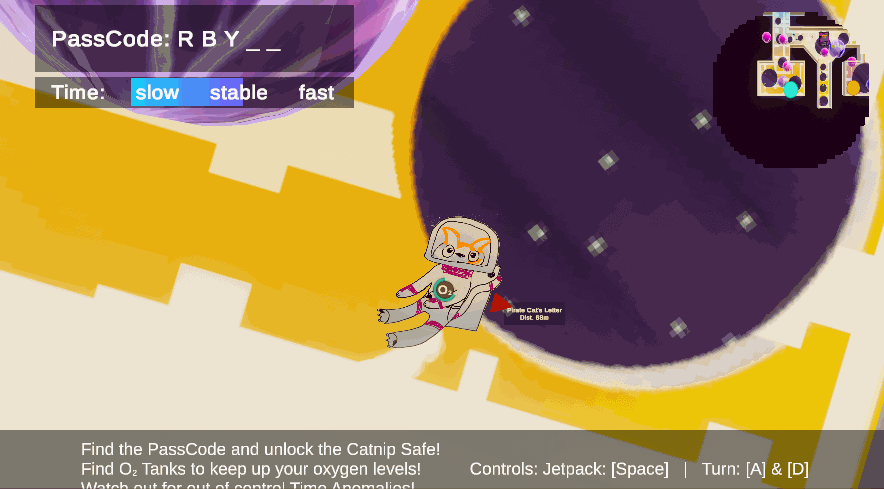 We wanted to evoke the feeling of not having control over time passing during quarantine, so you use a jetpack to navigate moving hazards that speed up and slow down time! We also wanted to put a cheerful spin on other elements of quarantine where we've had little control, so isolation becomes outer space, and there's cats,and personal belongings just floating around everywhere.