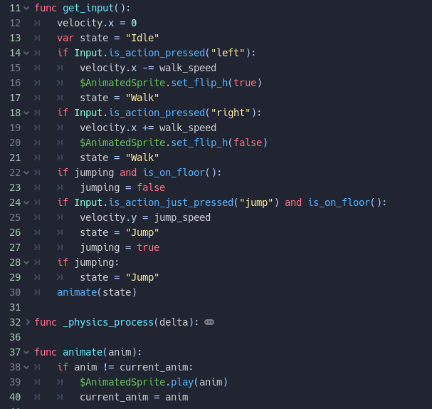 On the development side, I actually opened Godot for the first time since I've started working on this. I set up Mama as the player character with her movement and animations and set up the beginnings of the tileset I'll be making. Right now I have four different tiles with collisions. Adding the animations to Mama and making them change with input was surprisingly challenging. At first, it was stuck on the first frame since it was trying to reload the animation every frame when it checked inputs. I got around that by setting up states to tell the animation function what animation to play and only to change when the animation actually changes. This is how I finally got it to work: