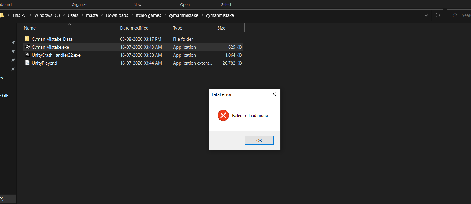I downloaded your files and put the two folders 'etc' and 'embedRuntime' outside the cyanmistake folder, inside and also into Cyan Mistake_Data and it's still not starting. So what am I doing wrong?