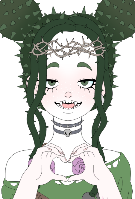 she can grow roots almost as hard as steel on her body, they usually end up having flowers and thorns on them . . it unavoidable ;w; also to much weight with the roots she can pass out from exhaustion, they're pretty heavy. she uses them often as sheild but sometimes she hits people with them. she her fangs from her dad, he had a wolf quirk.