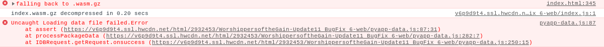 - "Uncaught Loading data file failed.Error" is the likely culprit. I've been unable to replicate it on a Linux + Chrome test machine though. The links you followed in the error message actually took you to the code to return the errors, not the errors themselves, which is unfortunate. I tried to do a search for the same error, but the only thing that came up for Itch or RenPy was your post, so I don't have much to go on.