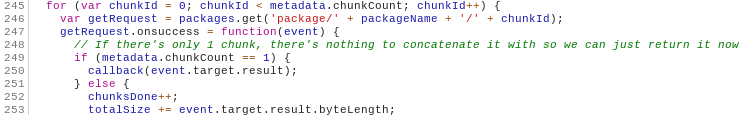 And, for some reason, code that doesn't seem to have anything in red, besides the "package" that I believe to be the save data that I don't have. However, the error link sent me to " callback(event.target.result); " instead of ' package/'.