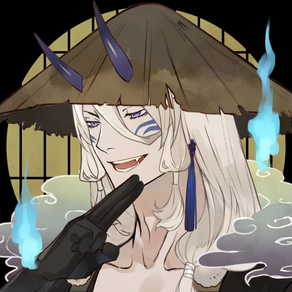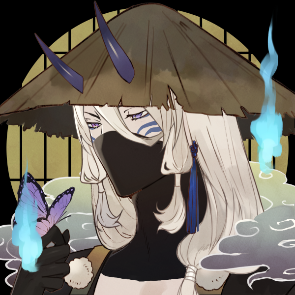 He looked over at him and let the butterfly go, it flew to the tip of his hat and he looked down and he saw his beautiful lavender eyes match his beautiful horns, he pulls his mask down.