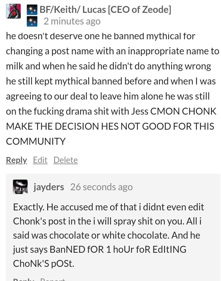 he doesn't deserve one he banned mythical for changing a post name with an inappropriate name to milk and when he said he didn't do anything wrong he still kept mythical banned before and when I was agreeing to our deal to leave him alone he was still on the fucking drama shit with Jess CMON CHONK MAKE THE DECISION HES NOT GOOD FOR THIS COMMUNITY