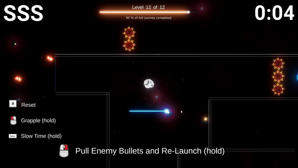Nice game! I always love a grappling hook haha. The slow mo felt good too. The shake effect when you hit the wall was impactful. I would say that the difficulty ramps up pretty quickly. I was already having a hard time on level 4.