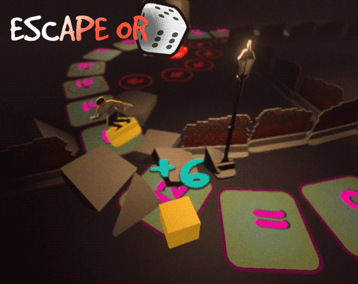 What a clever way to make a 'race to the exit board game' much more fun to play! I would have loved to see the dots on the dice or an end screen on victory, but I understand time constraints and all. Thanks for making me smile!