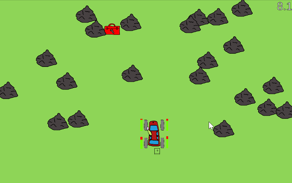 I had the toolboxes set to be 5% spawnrate but it still ended up being too high, I think 2-3 would have worked better as you are totally right - when testing my web build I would often just crash into the rocks to get to the toolbox. I think initally I had it restore less health to each wheel and changed it at some point? It's a shame I ran out of time for balancing all the numbers... As for the wheel repair I mostly intended to be a last resort until you can get a toolbox, but once again, I think the numbers are slightly too low.. ':D