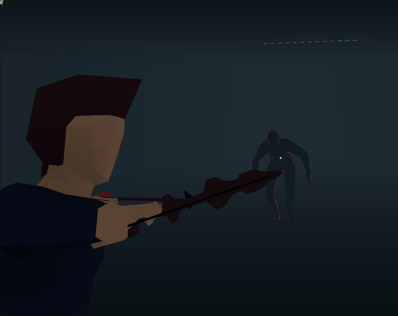 Fun game, there's a lot of tension. Since it's much harder to hit an enemy once they're close to you and sprinting, you have to be a bit cautious and explore slowly. The fog, the music, the low-poly art, it all works well. Short and sweet, it gets the concept across quite well. I wouldn't mind playing a full length game of that. A few notes: