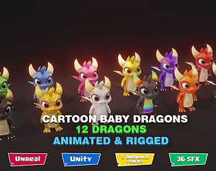 Cute Baby Dragons 3D Model includes 12 animated cute cartoon baby dragons + 5 fantasy music loops + 36 sound effects.
