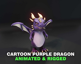 Cartoon Purple Dragon Animated 3D Model includes rig & 12 animations & facial expressions.