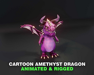 Cartoon Amethyst Dragon Animated 3D Model includes rig & 12 animations & facial expressions.